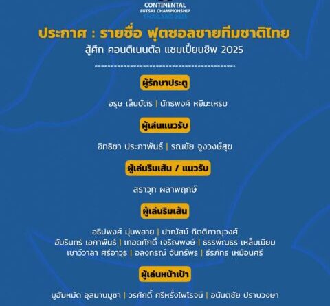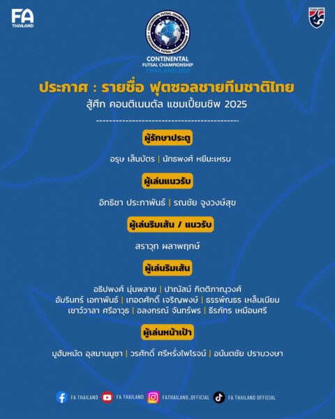 ประกาศ : รายชื่อ 16 แข้ง ฟุตซอลชายทีมชาติไทย สู้ศึก คอนติเนนตัล แชมเปี้ยนชิพ 2025 ที่นนทบุรี