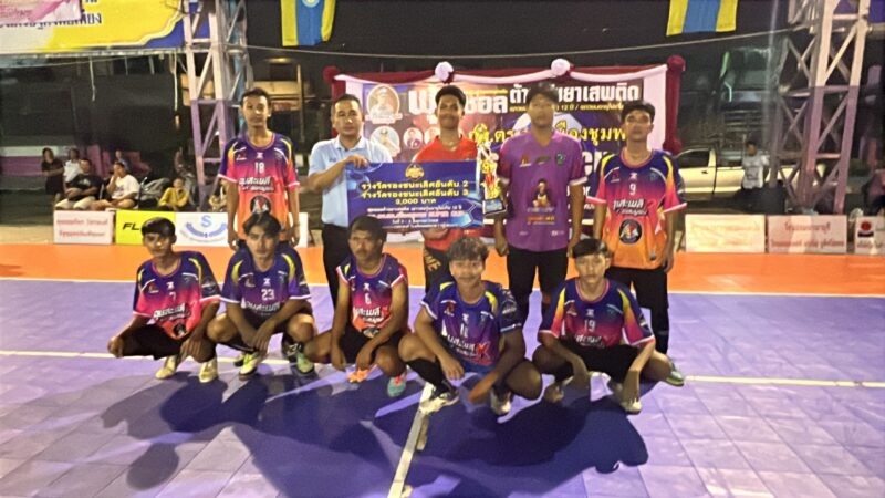 การแข่งขันในครั้งนี้จำนวน ๓๕ ทีม โดยมีวัตถุประสงค์ ดังนี้ ๑. เพื่อส่งเสริมให้เยาวชนในพี้นที่ใกล้เคียงให้มีสุขภาพแข็งแรงสมบูรณ์ รู้จักใช้ เวลาว่างให้เกิดประโยชน์ ห่างไกลจากอบายมุข และยาเสพติด ๒. เพื่อส่งเสริมให้เยาวชนตระหนักถึงการออกกำลังกายโดยใช้ กีฬาเป็นสื่อในการ พัฒนาร่างกายและจิตใจ ๓. เพื่อส่งเสริมให้เยาวชนได้มีความสามัคคี รู้แพ้ รู้ชนะ รู้อภัย มีน้ำใจนักกีฬา เกิดความสามัคคี และความสัมพันธ์อันดีภายในหมู่คณะ ๔. เพื่อให้เด็กและเยาวชนห่างไกลยาเสพติด ตามนโยบายของรัฐบาล ” No Drugs No Dealers ” รวมพลังยับยั้งปัญหายาเสพติด ผนึกกำลังชุมชนปลอดยาเสพติด ชิงเงินรางวัลรวมมูลค่า 50,000 บาท ผลสรุปทีมที่เข้าชิงชนะเลิศ อายุไม่เกิน12 ปี ทีม อนุบาลสวี อันดับที่ 1 ทีม ฉลามน้อย ระนอง อันดับที่ 2 ทีม รร.บ้านเขาถล่ม อัยดับที่ 3 ทีม สวนศรี. 29 อันดับที่ 4 อายุไม่เกิน 18ปี รร.ละเเมวิทยา อันดับที่ 1 ทีม. 13. น้ำ อันดับที่ 2 ทีม. อาเเคร์ ออฟติค อันดับที่ 3 ทีม อื้อ . ฮือ อันดับที่ 4