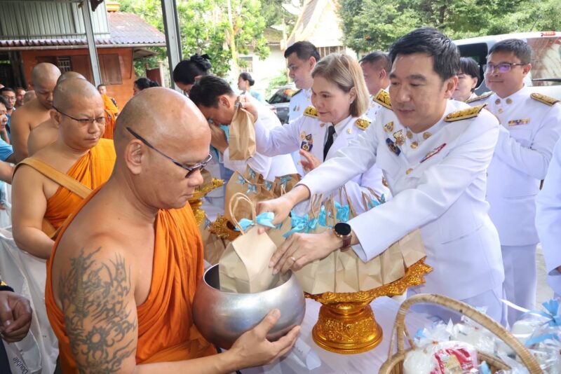 จากนั้นจึงถวายผ้าไตร เครื่องจตุปัจจัยไทยธรรม และภัตตาหารแด่พระสงฆ์จำนวน 10 รูป หลังจากพระสงฆ์ได้เจริญพระพุทธมนต์เพื่อความเป็นสิริมงคลแล้ว ผู้เข้าร่วมพิธีทั้งหมดจึงร่วมกันตักบาตรข้าวสารอาหารแห้ง เพื่อถวายเป็นพระราชกุศลแด่พระองค์ท่าน พิธีดังกล่าวดำเนินไปอย่างสมพระเกียรติและเรียบร้อย สะท้อนให้เห็นถึงความรักที่พสกนิกรมีต่อสถาบันพระมหากษัตริย์และพระราชกรณียกิจนานัปการที่ทรงปฏิบัติมาโดยตลอด