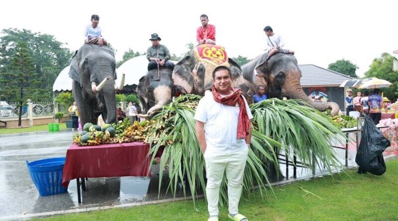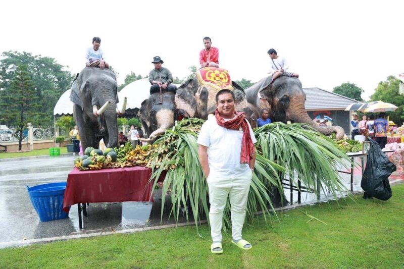 โดยในช่วงเช้าได้นิมนต์พระสงฆ์ 9 รูป เจริญพระพุทธมนต์ พิธีถวายภัตตาหารแด่พระภิกษุสงฆ์ และสังฆทาน จากนั้นได้จัดโต๊ะจีนเลี้ยงอาหารช้าง และได้มอบเงินทุนการศึกษาให้เด็กนักเรียน เรียนแต่ยากจนจำนวน 100,000 บาท