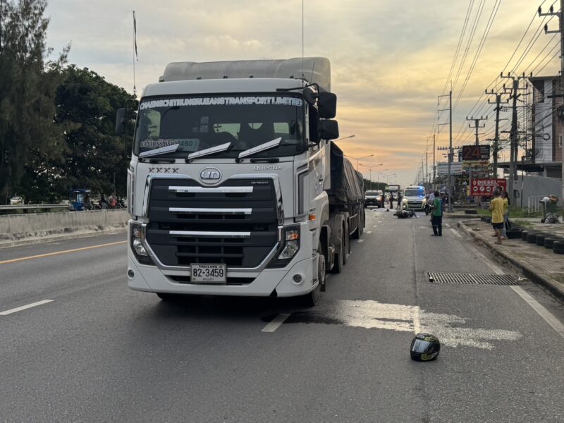 เมื่อเวลา 17.30 น. วันที่ 1 ตุลาคม 2568 พ.ต.ท.ยศวัจน์ ศรีลาพัฒน์ สารวัตรสอบสวน สภ.ธัญบุรี ได้รับแจ้งเหตุว่ามีอุบัติเหตุรถพ่วง22ล้อ ชนจักรยานยนต์เสียชีวิตคาที่ บริเวณหน้าหมู่บ้านเสนากรีนวิลล์ ถนนรังสิต-นครนายก (ฝั่งขาออก) ม.2 ต.บึงน้ำรักษ์ อ.ธัญบุรี จ.ปทุมธานี จึงรุดเข้าไปยังที่เกิดเหตุพร้อมกับกู้ชีพเทศบาลเมืองสนั่นรักษ์และอาสาสมัครมูลนิธิป่อเต๊กตึ๊ง ที่เกิดเหตุพบร่างชื่อนายนรภัทร พลูขวัญ อายุ 19 ปี ผู้ขับขี่จักรยานยนต์ ยี่ห้อฮอนด้า สกูปปี้คลับ 12 สีน้ำเงิน ไม่ติดแผ่นป้ายทะเบียน ชาว อ.ทับสะแก จ.ประจวบคีรีขันธ์ ห่างออกจากศพผู้เสียชีวิตประมาณ 50 เมตร พบรถพ่วงหัวราก 22ล้อ ป้ายทะเบียน 82-3459 สระแก้ว ผู้ขับขี่ชื่อนายขวัญชัย เจริญผล อายุ 49 ปี