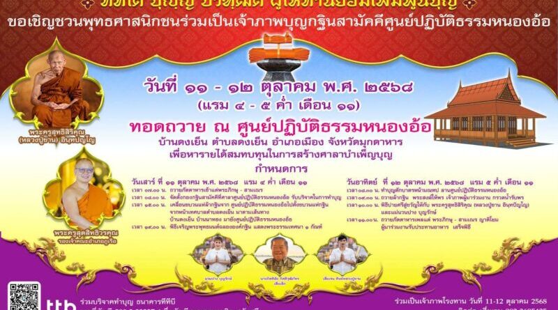 ขอเชิญเป็นเจ้าภาพบุญกฐินศูนย์ปฏิบัติธรรมหนองอ้อบ้านดงเย็น ตำบลดงเย็นอำเภอเมือง มุกดาหาร