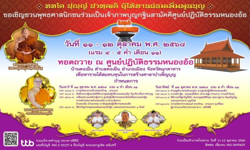 ขอเชิญเป็นเจ้าภาพบุญกฐินศูนย์ปฏิบัติธรรมหนองอ้อบ้านดงเย็น ตำบลดงเย็นอำเภอเมือง มุกดาหาร จังหวัดมุกดาหาร