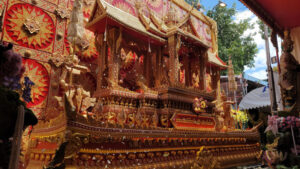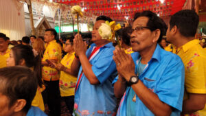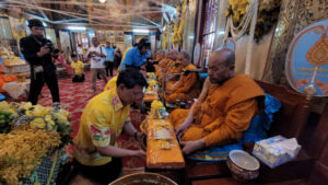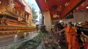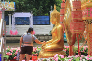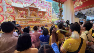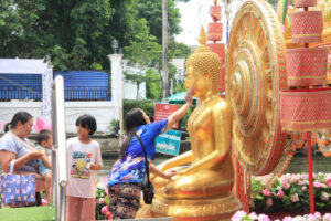 ซึ่งปีนี้ตรงกับวันที่ 6 ตุลาคม 2568 จะมีการอัญเชิญหลวงพ่อโตจำลอง ลงเรือแห่ไปตามลำคลองสำโรง เพื่อให้ประชาชนที่อยู่อาศัยบริเวณสองฝั่งคลอง และที่มาร่วมพิธีได้ร่วมสักการบูชา โดยการโยนดอกบัวลงไปในเรือที่องค์หลวงพ่อโตประดิษฐานอยู่ มีความเชื่อกันว่า หากสามารถโยนดอกบัวลงไปในเรือที่องค์หลวงพ่อโตประดิษฐานอยู่ได้แล้ว อธิษฐานสิ่งใดไว้ก็จะประสบความสำเร็จดังหวังทุกอย่าง