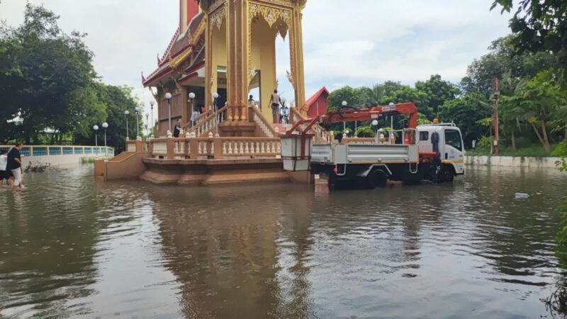 ปทุมธานี – น้ำล้นตลิ่งเข้าท่วมลานวัดริมแม่น้ำเจ้าพระยาปชช.ต้องแบกโลงศพใส่รถไปเผาที่เมรุ