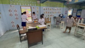 วันที่ 6 ต.ค. 68 ผู้สื่อข่าวรายงานสถานการณ์น้ำท่วม ที่บริเวณโรงเรียนวัดตาลเจ็ดช่อ ตำบลตลาดกรวด อำเภอเมือง จังหวัดอ่างทอง พบว่ามีมวลน้ำเจ้าพระยาไหลซึมผุดลอดใต้เขื่อน จนเอ่อล้นเข้าในพื้นที่โรงเรียนวัดตาลเจ็ดช่อ นักเรียนต้องเดินลุยน้ำท่วมสูง 20 – 30 เซนติเมตร เข้าโรงเรียน ส่วนครูใช้ไดโว่สูบน้ำออกจากห้องเรียน พร้อมย้ายนักเรียนที่เรียนอยู่ชั้นล่างขึ้นไปด้านบน 2 ของโรงเรียน โชคยังดี วันนี้เป็นวันสอบวันสุดท้าย พบว่านักเรียนที่เดินทางมาโรงเรียน พบเห็นน้ำท่วมต่างตื่นเต้น และออกมาเดินวิ่งเล่นน้ำที่ท่วมขังกันอย่างสนุกสนาน คุณครูต้องออกมาเตือนเพื่อให้ขึ้นไปด้านบนของโรงเรียน เพื่อป้องกันเสื้อผ้าเปียกปอนและลื่นล้มได้รับบาดเจ็บ ส่วนครูก็เร่งเก็บสิ่งของขึ้นไว้บนโต๊ะ