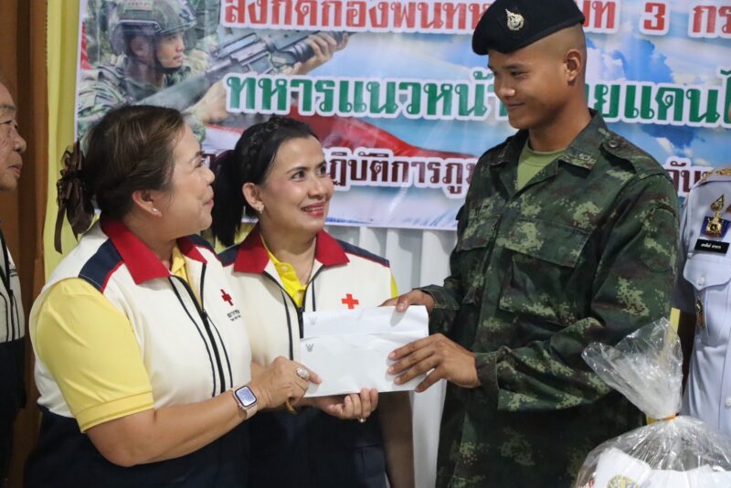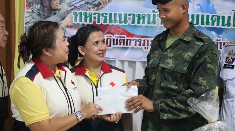 กำแพงเพชร////นายอำเภอพรายกระต่ายผูกแขนเรียกขวัญ “พลทหารไอซ์” ทหารกล้าภูมะเขือ ศรีษะเกษ หลังได้กลับบ้าน ชาวบ้านต้อนรับอย่างอบอุ่น เจ้าตัวเผยภูมิใจที่ได้ไปปกป้องประชาชน