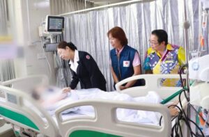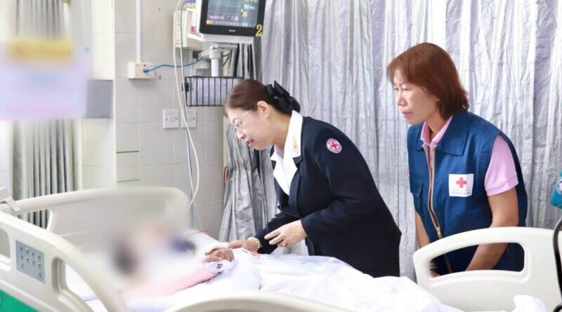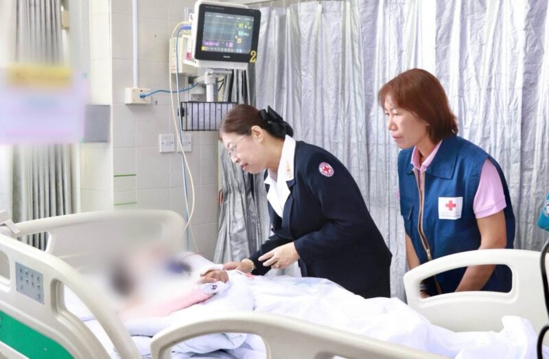 นายกเหล่ากาชาดชลบุรีเยี่ยมให้กำลังใจผู้ป่วยพลัดตกคอนโดฯ มอบความช่วยเหลือถึง รพ.ชลบุรี