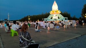 ส่วนบรรยากาศช่วงเย็น พุทธศาสนิกชนร่วมจุดประทีปโคมลาน 5,000 ดวง ถวายเป็นพุทธบูชาในวันออกพรรษา โดยมี ดร.โฆสิต สุวินิจจิต ประธานมูลนิธิพุทธอุทยานนานาชาติหนองคาย เป็นประธานในพิธีฯ สวดมนต์สรรเสริญคุณพระรัตนตรัย และจุดประทีปท่ามกลางพุทธศาสนิกชนที่พร้อมใจกันสวดมนต์ นั่งสมาธิ และอธิษฐานจิต และร่วมรับชมปรากฏการณ์บั้งไฟพญานาคริมแม่น้ำโขง