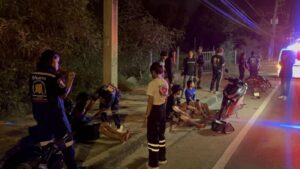 เมื่อเวลา 01.20 น. วันที่ 7 ตุลาคม 2568 ศูนย์วิทยุหน่วยกู้ภัยสว่างบริบูรณ์ธรรมสถานเมืองพัทยา รับแจ้งอุบัติเหตุรถจักรยานยนต์เฉี่ยวชนกับรถยนต์เก๋ง มีผู้ได้รับบาดเจ็บหลายราย เหตุเกิดบนถนนสุขุมวิทพัทยา หน้าวัดจิตตภาวัน ต.นาเกลือ อ.บางละมุง จ.ชลบุรี หลังรับแจ้งจึงนำกำลังเจ้าหน้าที่กู้ภัยสว่างบริบูรณ์ธรรมสถานเมืองพัทยารีบไปตรวจสอบ