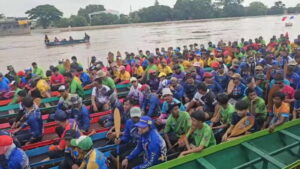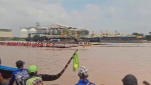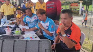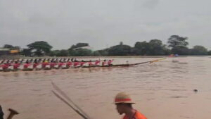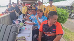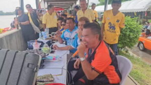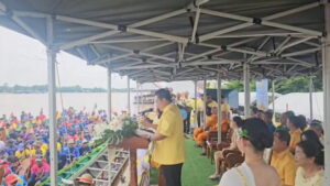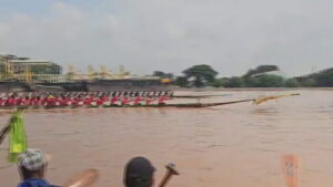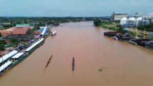 อ่างทอง – สีสันทีมพากย์เรือพายที่จัดเต็มในงานแข่งขันเรือยาวประเพณี งานนัมสการปิดทองหลวงพ่อโตพระพุทธไสยาสน์ วัดป่าโมกวรวิหาร ณ แม่น้ำเจ้าพระยา หน้าวัดป่าโมก