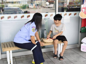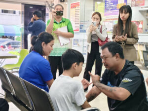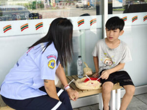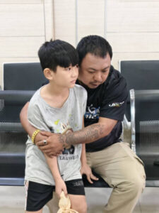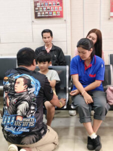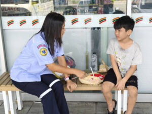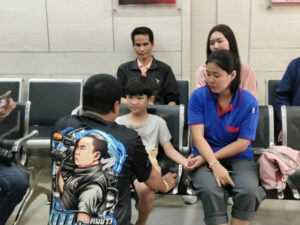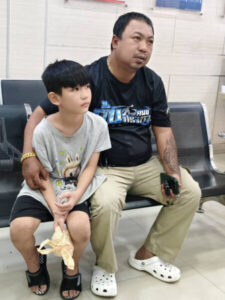 พอเจ้าหน้าที่เดนิทางไปถึงก็พบว่ามีเด็กชายวัย 10 ขวบ ชาวกระเหรี่ยง คนหนึ่งนั่งร้องไห้อยู่หน้าร้านสะดวกซื้อจริง จึงมีการเข้าพูดคุยพร้อมทั้งหาอาหารน้ำดื่มและขนมให้น้องได้ทานเพื่อบรรเทาความหิว ซึ่งจากการพูดคุยสอบถามทางด้านตัวเด็กชายรายนี้อ้างว่าสาเหตุที่ต้องหอบเสื้อผ้าหนีอกมาจากห้องพักนั้น เพราะว่าถูกพ่อแท้ๆบีบคอและขู่ว่าจะกลับมาตี จึงหวาดกลัวและตัดสินใจหนีออกมาข้างนอก