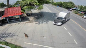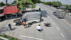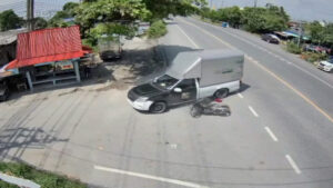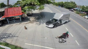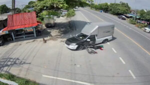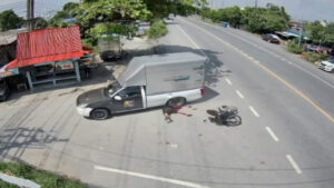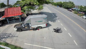 ภาพจากกล้องวงจรปิดริมถนนปานวิถีช่วงบ้านท้องคุ้ง หมู่ที่ 3 ตำบลคลองด่าน อำเภอบางบ่อ จังหวัดสมุทรปราการ จับภาพได้ช่วงเวลา 12.15 น. วันที่ 8 ตุลาคม 2568 จากภาพวงจรปิดมุมนี้จะเห็นจังหวะที่มีรถกระบะตู้ทึบคันหนึ่งเลี้ยวขวาข้ามเลนเพื่อจะเข้าซอย จังหวะนั้นเองมีรถจักรยานยนต์คันหนึ่งที่ขับมาทางตรงฝั่งตรงข้าม เจ้าตัวพยามเบรกรถกะทันหันจนรถจักรยานยนต์ล้มไถลไปชนกับล้อรถพร้อมคนขับ ซึ่งตัวคนขับรถจักรยานยนต์คันนี้ไถลแล้วศีรษะมุดไปติดคาล้อหลังของรถกระบะ เจ้าตัวพยามดิ้นออกจากล้อรถและใต้ท้องรถแต่ก็ไม่ออก แถมคนขับรถกระบะพยามเลื่อนรถอีก ทำให้เจ้าตัวตัดสินใจยกเท้าเตะตัวรถกระบะเพื่อเรียกให้คนขับจอดรถลงมาช่วย จากนั้นไม่นานก็มีชาวบ้านแถวนั้นออกมาช่วยกันและบอกให้คนขับค่อยๆถอยหลังรถจนชายคนขับรถจักรยานยนต์สามารถดึงหัวออกมาได้อย่างปลอดภัย เรียกว่าโกงความตายเพียงเสี้ยววินาที และเคราะห์ดีที่จังหวะที่คนขับรถกระบะพยามเคลื่อนรถไปข้างหน้าแล้วคนขับรถจักรยานยนต์ใช้เท้าเตะกระบะเพื่อเรียกคนขับรถให้จอดรถลงมาดู