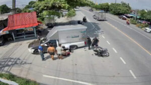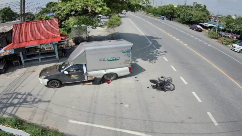 หนุ่มบางปะกง โกงความตายขี่มอไซค์เจอรถกระบะตัดหน้าเบรกล้มไถลหัวเข้าใต้ท้องรถหวิดล้อทับ