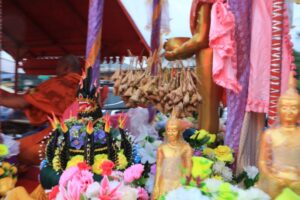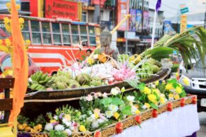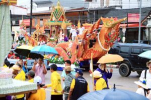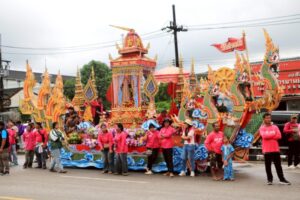 ภายในงานมีขบวนเรือพนมพระจากวัด สำนักสงฆ์และชุมชนต่าง ๆ ในพื้นที่อำเภอคุระบุรี เข้าร่วม 10 ขบวน ซึ่งเรือพระของแต่ละคัน ต่างประดับตกแต่งด้วยดอกไม้ ผลไม้และขนมต้ม ผสมผสานกับศิลปวัฒนธรรมของท้องถิ่นอย่างงดงาม ทำการผูกเชือกกับตัวเรือแล้วทำการชัก หรือ ลากไปบนถนน ที่นำด้วยขบวนฟ้อนรำ ขบวนพาเหรด และการแสดงศิลปวัฒนธรรมพื้นบ้านที่สร้างความคึกคักและสีสันให้กับงานอย่างมาก โดยขบวนเรือพนมพระจะไปจอดที่ด้านหน้าที่ว่าการอำเภอคุระบุรี เพื่อประกอบพิธีสมโภชกันในคืนนี้