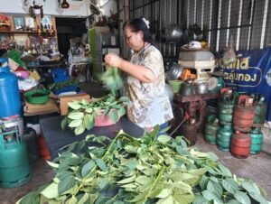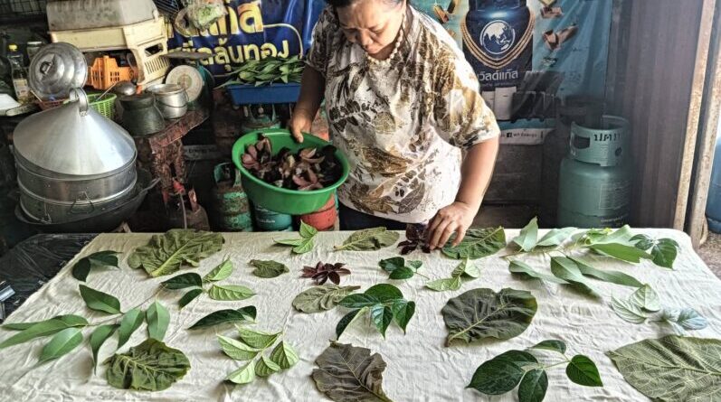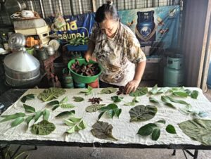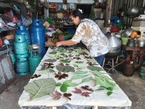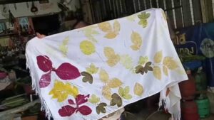 สิ่งที่สำคัญที่สุดก็คือต้องเรียนรู้และรู้จักใบไม้แต่ละชนิดว่าชนิดใหนให้สีอะไรตัวอย่างเช่น ใบสักจะให้สีแดง ใบยูคาจะให้สีเหลือง ใบสบู่เลือดจะให้สีเขียว ใบเพกาจะให้สีเหลืองส้ม และซิลเวอร์โอ๊ก เป็นต้น กระบวนการขั้นตอนแรก เตรียมผ้าซึ่งเป็นผ้าฝ้ายพื้นเมืองตามธรรมชาติมี 2 ชนิด คือผ้าฝ้ายชินมัยที่เป็นผ้าทอจากเส้นใยฝ้าย 100% และผ้าฝ้ายหนังกบ ต้องไม่กัดสีคือเป็นผ้าฝ้ายตามธรรมชาติเลย ถ้าเป็นผ้าที่กัดสีแล้วเวลาพิมพ์ สี่ของใบไม้จะไม่ค่อยติดหรือติดก็จะจางลายยใบไม้แต่ละชนิดจะไม่โดเด่นสวยงาม ซึ่งผ้าฝ้ายทั้ง 2 ชนิดนี้จะแตกต่างกัน ผ้าฝ้ายชินมัยเนื้อผ้าจะหนาเหมาะในการทำหมวกหรือทำกระเป๋า ส่วนผ้าฝ้ายหนังกบจะบางและเบาเหมาะกับการตัดเสื้อกางเกงถ้าใครชอบธรรมชาติบอกได้เลยตัวนี้ตอบโจทย์เพราะไม่มีสารเคมีเข้ามาเจือปน ขั้นตอนต่อมาคือการเอาผ้าที่จะนำมาพิมพ์ไปแช่ในน้ำกัดสนิมทิ้งไว้ประมาณ 2 ชั่วโมงนำออกไปใช้งานได้เลย ซึ่งน้ำกัดสนิมนี้ตนเองก็คิดและปรับปรุงขึ้นเป็นเทคนิคในการเรียนรู้มาจะประกอบไปด้วยปูนชาวสารส้มเกร็ด น้ำส้มสายชู หกทิ้งไว้ในภาชนะหรือถังที่เตรียมไว้เวลาต้องการใช้ก็ตักเอามาใส่ถังในการแช่ผ้า ต่อมาก็เป็นการเตรียมใบไม้แต่ละชนิดที่จะวางบนผืนผ้าซึ่งใบไม้เหล่านั้นจะต้องสดส่วนใหญ่ใบไม้ทุกชนิดจะอุดมสมบูรณ์ในช่วงหน้าฝนการให้สีก็จะโดดเด่น โดยจะพิมพ์ครั้งละ 2 หลาซึ่งก็จะทำมากกว่า 2 หลาก็ได้ แต่เนื่องจากโต๊ะที่จะวางผ้ายาวเพียง 2 หลาเท่านั้น ขั้นตอนถัดไปคือการนำผ้าที่แช่ไว้ในถังน้ำกัดสนิมมา โดยเอาพลาสติกปูวางบนพื้นโต๊ะและนำใบไม้หลากหลายชนิดที่เตรียมไว้ซึ่งก็จะต้องเป็นใบไม้ที่สดวางไปบนผืนผ้าให้เต็มนำผ้าส่วนที่เกินอยู่พับปิดทับลงไป จากนั้นให้นำพลาสติกปิดทับอีกครั้งและทำการม้วนจนสุดผืนผ้านำพลาสติกมาพันม้วนผาให้แน่นโดยไม่ให้มีน้ำซึมเข้าไปบนผืนผ้า หลังจากนั้นก็นำม้วนผ้าไปใส่ในหม้อนึ่งที่มีความร้อนสูง ทิ้งไว้ประมาณ 1.30-2 ชั่วโมง