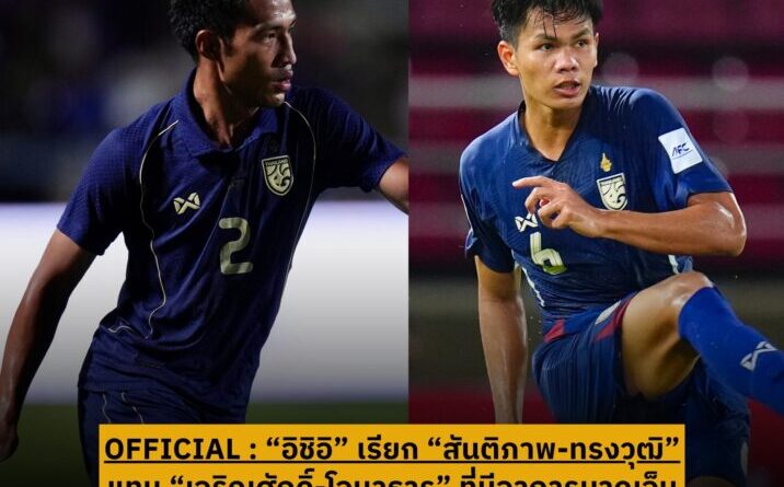 “มาซาทาดะ อิชิอิ” หัวหน้าผู้ฝึกสอนฟุตบอลชายทีมชาติไทย เรียกตัว “สันติภาพ จันทร์หง่อม” แบ็คขวาจากสโมสร ชลบุรี เอฟซี และ “ทรงวุฒิ ใคร่ครวญ” กองหลังจากสโมสร เมืองทอง ยูไนเต็ด เข้ามาแทนที่ “เจริญศักดิ์ วงษ์กรณ์” และ “โจนาธาร เข็มดี” ที่มีอาการบาดเจ็บจากการแข่งขันฟุตบอลเอเชียน คัพ 2027 รอบคัดเลือก กลุ่มดี นัดที่สาม