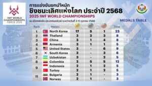 สรุปการแข่งขันยกน้ำหนักชิงชนะเลิศแห่งโลก ประจำปี 2568 มีการชิงชัย หญิง 8 รุ่น ชาย 8 รุ่น รวม 48 เหรียญทอง เกาหลีเหนือกวาดไปมากที่สุดถึง 17 เหรียญทอง 5 เหรียญเงิน 1 เหรียญทองแดง , อันดับสอง ประเทศไทยคว้า 3 เหรียญทอง 2 เหรียญเงิน 3 เหรียญทองแดง ขณะที่จีน อยู่อันดับ 3 มี 3 เหรียญทอง 1 เหรียญเงิน และ 4 เหรียญทองแดง