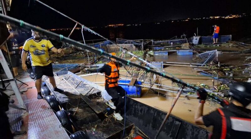 มุกดาหาร – กระชังปลาลอยมาตามน้ำโขง จำนวน 60 หลุม ไหลมาชนแพตำรวจน้ำมุกดาหาร เจ้าหน้าที่เร่งรื้อถอดลดแรงต้านป้องกันแพจม