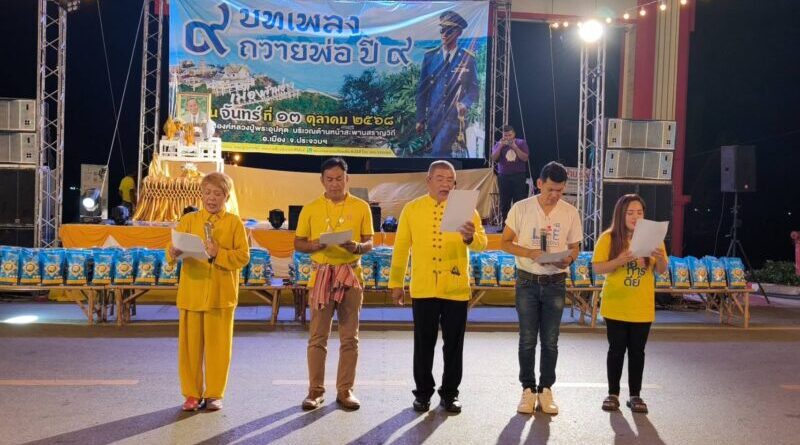 วันที่ 13 ตุลาคม 2568 เวลา 19.00 น. ที่วิหารพระอุปคุต บริเวณหน้าสะพานสราญวิถี ถนนเลียบชายหาดทะเลอ่าวประจวบคีรีขันธ์ อำเภอเมืองประจวบคีรีขันธ์ นายสิทธิชัย สวัสดิ์แสน ผู้ว่าราชการจังหวัดประจวบคีรีขันธ์ เป็นประธานในกิจกรรมขับขาน 9 บทเพลงถวายพ่อปีที่ 9 โดยมี พญ.บุษกร สวัสดิ์แสน ประธานแม่บ้านมหาดไทยจังหวัดประจวบคีรีขันธ์ นายประทีป บริบูรณ์รัตน์ นายปรีดา สุขใจ รองผู้ว่าราชการจังหวัดฯ พร้อมด้วย ผู้แทนนายอำเภอเมืองประจวบฯ หัวหน้าส่วนราชการ ข้าราชการ กลุ่มเพ็ญพุธประจวบ คณะผู้ก่อการดีย์ ผู้บริหารบริษัทห้องเย็น ป.ปนัฐดา อินเตอร์มารีนฟู้ด และประชาชนชาวจังหวัดประจวบฯ ได้พร้อมใจกันสวมใส่เสื้อสีเหลือง เข้าร่วมกิจกรรม ประมาณ 1000 คน