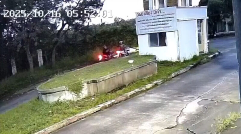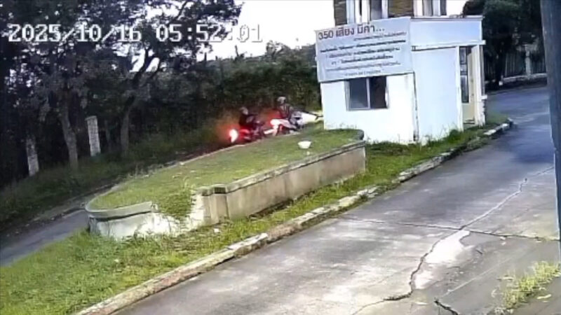 ภาพจากกล้องวงจรปิดอีกมุม จะเห็นชัดเจนในจังหวะที่คนร้ายรายนี้ ขับขี่รถจักรยานยนต์สีขาวไม่ติดผ่านป้ายทะเบียนและคนร้ายชายหนึ่งคนสวมหมวกกันน็อกเต็มใบปิดบังใบหน้า ตามประกบรถจักรยานยนต์ของผู้เสียหายจนมาถึงป้อม รปภ. ทางเข้าหมู่บ้านเพื่อเรียกให้ผู้เสียหายจอดรถ โดยชักปืนจี้ข่มขู่ จนผู้เสียหายท่านนี้ตกใจกลัวจนรถล้มลง
