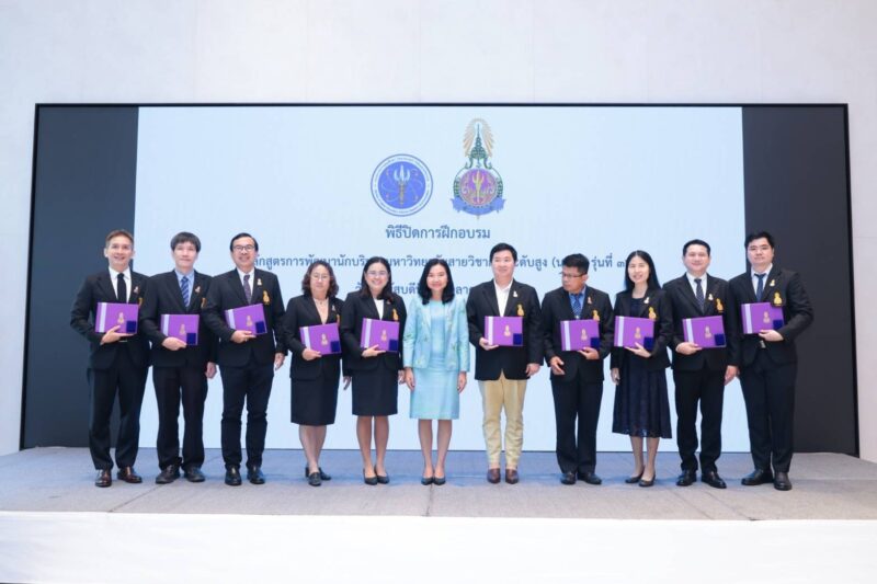 เมื่อวันที่ 16 ตุลาคม 2568 นางสาววราภรณ์ รุ่งตระการ รองปลัดกระทรวงการอุดมศึกษา วิทยาศาสตร์ วิจัยและนวัตกรรม (อว.) เป็นประธานในพิธีปิดการฝึกอบรมและมอบประกาศนียบัตร พร้อมเข็มเชิดชูเกียรติแก่ ผู้สำเร็จการอบรมหลักสูตร “การพัฒนานักบริหารมหาวิทยาลัยสายวิชาการระดับสูง” (นบม.) รุ่นที่ 32 ซึ่งจัดโดยสำนักงานปลัดกระทรวง อว. ร่วมกับมูลนิธิส่งเสริมทบวงมหาวิทยาลัย โดยมี นายสุทน เฉื่อยพุก ผู้อำนวยการกองส่งเสริมและพัฒนาทุนทางปัญญา สำนักงานปลัดกระทรวง อว. เข้าร่วมในพิธี พร้อมด้วยรองอธิการบดี คณบดี ผู้อำนวยการ และผู้บริหารจากสถาบันอุดมศึกษาทั้งภาครัฐและเอกชน รวม 46 คน จาก 37 แห่ง และบุคลากรจาก สำนักงานปลัดกระทรวง อว. ณ โรงแรมพูลแมน คิงเพาเวอร์ รางน้ำ กรุงเทพฯ