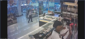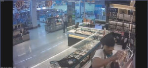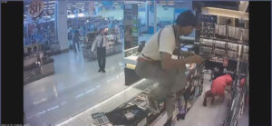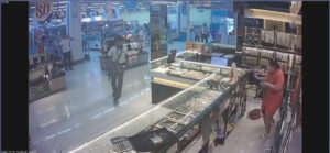 ภาพจากกล้องวงจรปิด สามารถจับภาพ พนักงานกำลังยืนจัดของอยู่ภายในร้าน คนร้าย สวมเสื้อยืดสีขาวแขนสั้น กางเกงขายาวสีเทา สวมหมวกไอ้โม่งสีดำไว้บนหัว ไม่ปิดบังใบหน้า สวมรองเท้าผ้าใบสีเทาขาว สะพายกระเป๋าสีเทาขาว ในมือถือปืนอยู่ ได้กระโดดปีนข้ามตู้ด้านหน้าเข้าไปเอามือกวาดทองที่อยู่ในตู้ด้านหลังไป ก่อนจะรีบปีนแล้ววิ่งออกไป