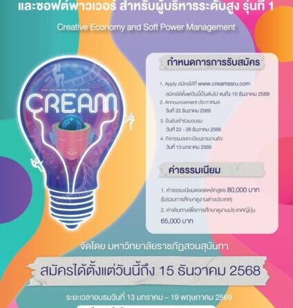 สถาบันการจัดการเศรษฐกิจสร้างสรรค์ มหาวิทยาลัยราชภัฏสวนสุนันทา เปิดรับสมัครผู้บริหารเข้าร่วม “หลักสูตรการจัดการเศรษฐกิจสร้างสรรค์และซอฟต์พาวเวอร์ สำหรับผู้บริหารระดับสูง” มุ่งเสริมสร้างวิสัยทัศน์เชิงกลยุทธ์และทักษะการบริหาร เพื่อขับเคลื่อนพลัง Soft Power ของไทยให้ก้าวสู่เวทีโลกอย่างยั่งยืน