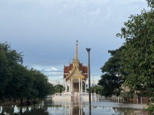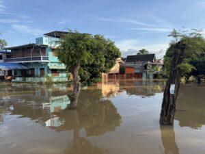 วันที่ 19 ต.ค.2568 ผู้สื่อข่าวรายงายว่า สถานการณ์น้ำในแม่น้ำเจ้าพระยาล้นท่วมพื้นที่ชุมชนวัดเจดีย์ทอง ม.1 ต.คลองควาย อ.สามโคก จ.ปทุมธานี เนื่องจากเขื่อนเจ้าพระยาปรับการระบายน้ำท้ายเขื่อน จากอัตรา 2,400 เป็นอัตรา 2,500 ลบ.ม./วินาทีแและฝนตกนานติดต่อกันหลายวันโดยมีบ้านเรือนกว่า 140 หลังคาเรือนที่อยู่นอกแนวคันกั้นน้ำ ได้รับความเดือดร้อนทุกหลังคาเรือน