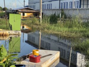 โดยน้ำไปได้ท่วมมานานกกว่า 2 เดือน ทำให้เส้นทางเข้าออกเป็นไปด้วยความยากลำบากเนื่องจากระดับน้ำท่วมสูงเกินกว่า 1 เมตรต้องใช้เรือในการสัญจรเข้าออกทุกหลังคาเรือนโดย ชาวบ้าน ได้ร่วมกันทำสะพานเหล็กชั่วคราวเพื่อเป็นทางเดินมาถึงหน้าวัดเจดีย์ทองที่มีถนนแนวคันกั้นน้ำเพื่อไปทำงาน ทั้งนี้ทางเดินในชุมชนไม่สามารถทำสะพานได้เนื่องจากน้ำลึกมาก จึงต้องใช้เรือและโฟมในการสัญจร