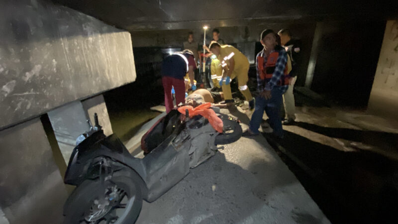 รถจักรยานยนต์รับจ้างกลับรถใต้สะพานศีรษะชนขอบสะพานคนขับตกน้ำดับ