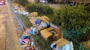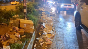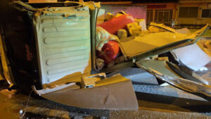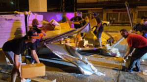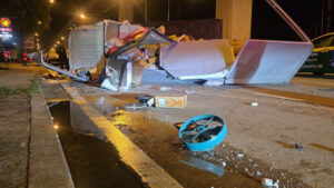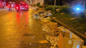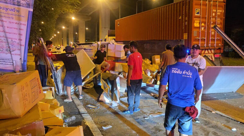 รถขนส่งเอกชนหักหลบรถยูเทิร์นตัดหน้าจนเสียหลักพลิกตะแคงตู้แตกเทกระจาดสินค้าเกลื่อนถนน