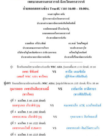ชูโรงคู่เอก กุมารดอย เพชรยินดีอะคาเดมี่ ชิงแชมป์สภามวยโลกแห่งเอเชีย(WBC ASIA) รุ่นซูเปอร์ฟลายเวท 115ปอนด์ พบ เรย์มาร์ค อาลิคาบา(ฟิลิปปินส์) คู่รอง เพชร ซีพีเอฟ ป้องกันแชมป์สภามวยโลกแห่งเอเชีย WBC ASIA รุ่นแบนตั้มเวท118ปอนด์ พบ คาร์โล เดเมซิลโล (ฟิลิปินส์)พร้อมคู่มวยไทยที่จะไปเสริฟความมันส์ อีก4คู่ ยิงสดช่องทรู24 เวลา 16.00 -18.00น.