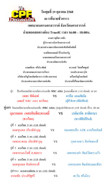 ความเคลื่อนไหวศึกCPFมวยมันส์สนั่นโลก นัดสัญจรวันพุธที่ 29 ตุลาคม 2568 ณ เวทีมวยชั่วคราวเทศบาลนครนครสวรรค์ จ.นครสวรรค์ ยิงสดช่องทรูเวลา 16.00-18.00น. จัดโดย เสี่ยตังค์ โปรโมเตอร์ปิยะรัตน์ วชิรรัตนวงศ์ ร่วมกับ บริษัทเจริญโภคภัณฑ์อาหารจำกัดมหาชน วางคู่เอก กุมารดอย เพชรยินดีอะคาเดมี่ ชิงแชมป์สภามวยโลกแห่งเอเชีย(WBC ASIA)รุ่นซูเปอร์ฟลายเวท 115ปอนด์ พบ เรย์มาร์ค อาลิคาบา(ผู้ท้าชิงชาวฟิลิปปินส์) คู่รอง เพชร ซีพีเอฟ ป้องกันแชมป์สภามวยโลกแห่งเอเชีย WBC ASIA รุ่นแบนตั้มเวท118ปอนด์ พบ คาร์โล เดเมซิลโล (ผู้ท้าชิงชาวฟิลิปปินส์),อรรถชัย ประเสริฐศรี พบ ตะวัน ศรีเมือง พิกัด 122ปอนด์