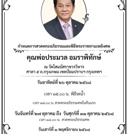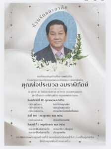 คณะญาติและครอบครัวอมราพิทักษ์ ขอเรียนเชิญญาติสนิท มิตรสหาย ข้าราชการ และผู้มีเกียรติร่วมไว้อาลัยและส่งดวงวิญญาณ “คุณพ่อประมวล” สู่สุคติ ณ วัดโสมนัสราชาวรวิหาร