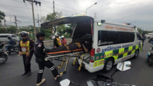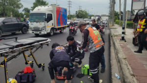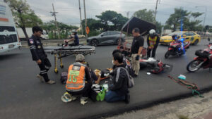เมื่อเวลา 07.25 น. วันที่ 28 ตุลาคม 2568 ศูนย์วิทยุกู้ชีพปราการ ได้รับแจ้งมีอุบัติเหตุรถจักรยานยนต์พ่วงข้างชนขอบฟุตบาทล้ม มีผู้ได้รับบาดเจ็บ เหตุเกิดบนถนนสุขุมวิท บริเวณหน้า สวางคนิเวศ ตำบลท้ายบ้านใหม่ อำเภอเมือง จังหวัดสมุทรปราการ หลังรับแจ้งจึงประสาน เจ้าหน้าที่มูลนิธิร่วมกุศลสมุทรปราการ เดินทางตรวจสอบที่เกิดเหตุ