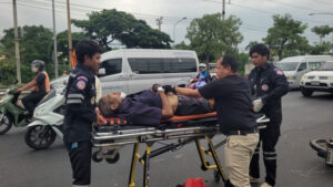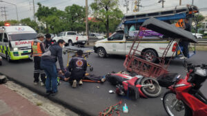 ลุงวัย 62 ขี่ซาเล้งพ่วงข้างล้อตกร่องระหว่างฟุตบาทล้มเจ็บ