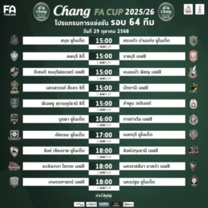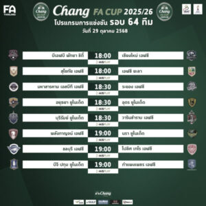 การแข่งขันฟุตบอลรายการ “ช้าง เอฟเอ คัพ” ฤดูกาล 2025/26 รอบ 64 ทีมสุดท้าย ฟุตบอลถ้วยน็อกเอาท์ที่ยิ่งใหญ่ที่สุดของประเทศไทย รายการที่ไม่มีเวทีให้กับผู้แพ้ รวมถึงเป็นเวทีสร้าง “แจ็คผู้ฆ่ายักษ์” มาแล้วนักต่อนัก
