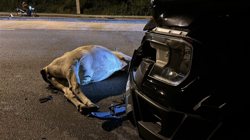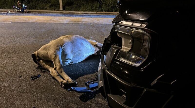 เกิดอุบัติเหตุ รถยนต์กระบะชนแม่วัวท้องแก่ คนขับบาดเจ็บ แม่วัวเสียชีวิตคาที่ พร้อมลูกในท้อง