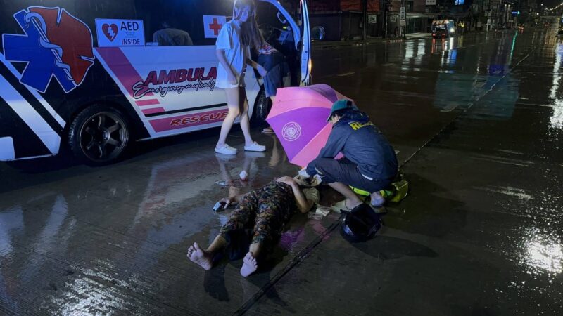 หนุ่มขี่ จยย.ผ่าสายฝนถนนลื่นชนท้ายรถขยะเจ็บสาหัส