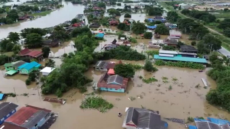 อ่างทอง ภาพมุมสูงคันกั้นน้ำคลองโผงเผงพังบริเวณหมู่5น้ำไหลทะลักเข้าท่วมหมู่บ้านกว่า100หลังคาเรือน ชาวบ้านเร่งเก็บข้าวของหนีน้ำกันวุ่น ขณะที่น้ำเจ้าพระยาเพิ่มขึ้นอย่างต่อเนื่อง