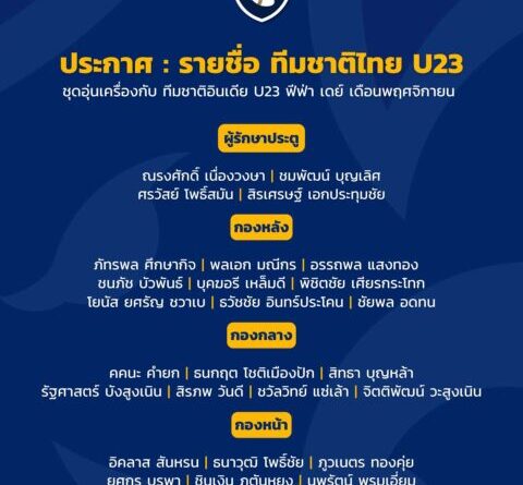 สมาคมกีฬาฟุตบอลแห่งประเทศไทย ในพระบรมราชูปถัมภ์ ประกาศรายชื่อ 23 นักฟุตบอลชายทีมชาติไทย รุ่นอายุไม่เกิน 23 ปี เตรียมความพร้อมสำหรับการแข่งขันฟุตบอลอุ่นเครื่องนัดพิเศษ ที่จะพบกับ ทีมชาติอินเดีย U23 ในช่วงฟีฟ่า เดย์ ระหว่างวันที่ 10-18 พฤศจิกายน 2568 ภายใต้การคุมทัพของ “โค้ชวัง” ธวัชชัย ดำรงอ่องตระกูล หัวหน้าผู้ฝึกสอน
