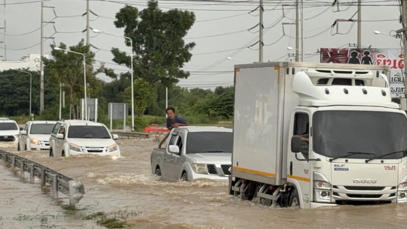 ส่วนบริเวณคอสะพานข้ามแม่น้ำเจ้าพระยา (ฝั่งตลาดป่โมก) มีการวางแบร์ริเออร์ขนานกับถนนและบริเวณริมน้ำเจ้าพระยา พบว่ายังมีน้ำเอ่อล้นเข้ามาด้านในถนน ไหลลงคลองชลประทาน ถนนมีน้ำท่วมขัง ความสูงประมาณ 40 – 70 ซม. เป็นระยะทาง 300 เมตร ยังพบว่ามีรถบรรทุกและรถยนต์กระบะ ใช้เส้นทางดังกล่าวสัญจรฝั่งขาเข้าตลาดป่าโมก รถยนต์กระบะบางคันใช้เส้นทางดังกล่าว (แต่ไม่แนะนำ หากไม่ใช่รถยกสูง) ฝั่งขาออกจากตลาดป่าโมก ข้ามมา มีรถบรรทุกใช้เส้นทาง (แต่ยังไม่แนะนำ) ข้อพึงระวัง รถจักรยานยนต์ งดใช้เส้นทางดังกล่าว (ชั่วคราว)