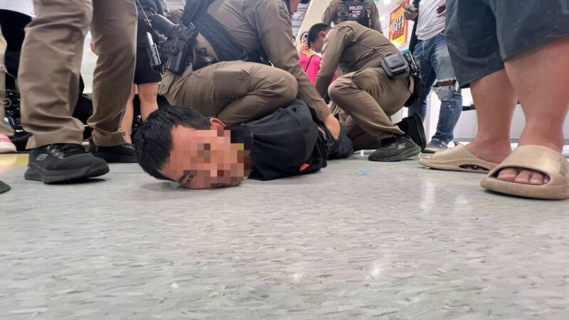 พฤติการณ์กล่าวคือ เจ้าหน้าที่ตำรวจสายตรวจเขต 2 ได้รับแจ้งจากผู้จัดการร้านทอง ทางโทรศัพท์ส่วนตัวว่ามีเหตุชิงทรัพย์ที่ร้านทองเยาวราชเอ็มโกลด์ ภายในโลตัสกระทุ่มแบน หมู่ที่ 1 ต.คลองมะเดื่อ อ.กระทุ่มแบน จ.สมุทรสาคร มีผู้ก่อเหตุเป็นชาย 1 คน ใช้อาวุธปืนในการก่อเหตุทรัพย์ทองคำโดยได้กระโดดข้ามเคาน์เตอร์และเข้าไปทุบกระจกชั้นวางด้านใน โดยนำทองจำนวน 55 บาทราคามูลค่าโดยประมาณ 3,200,000 บาท(ทราบภายหลัง) ใส่ถุงผ้าสี่ดำที่เตรียมมาด้วย แต่ได้ทำถุงผ้าหล่น จึงได้ถือทองจะวิ่งหลบหนีและทำหล่นอยู่หน้าร้านขณะหลบหนี เจ้าหน้าที่ตำรวจจึงได้รีบเดินทางมาที่เกิดเหตุ พบเจ้าหน้าที่ตำรวจสภ.กระทุ่มแบนฝ่ายสืบสวนอยู่ในที่เกิดเหตุและได้ร่วมกันควบคุมตัวผู้ก่อเหตุไว้ได้ นำตัวกลับสภ.กระทุ่มแบน เพื่อดำเนินคดีตามกฎหมายต่อไป