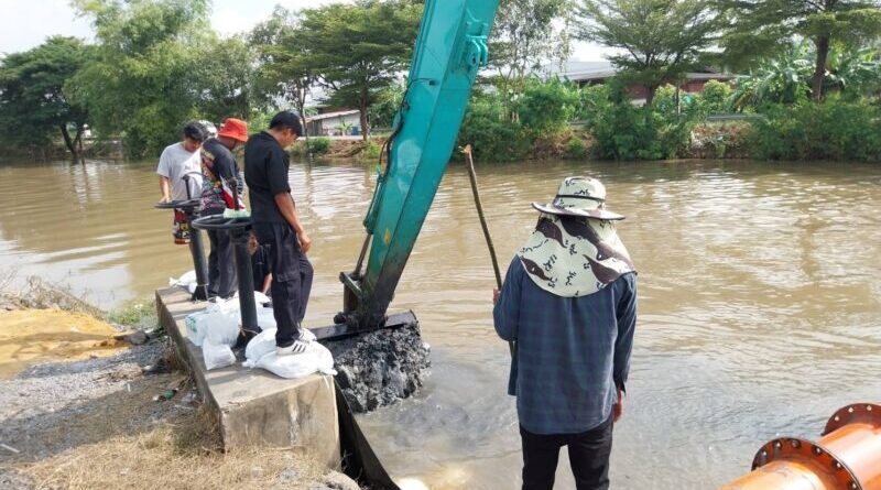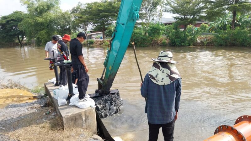 ปทุมธานีน้ำซึมคลองสามวาอบจ.ส่งแม็คโครบูมยาวช่วยอบต.ลาดหลุมแก้วอุดรอยรั่วประตูน้ำ