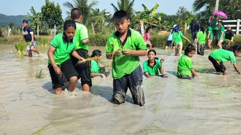 ทั้งนี้เด็กนักเรียนยุวเกษตรกร จำนวน 5 โรงเรียนที่มาร่วมกิจกรรมในวันนี้ ถึงแม้ว่ามาจากต่างโรงเรียน ต่างพื้นที่ แต่วันนี้รวมใจเป็นหนึ่งเดียว จับมือกันลงแขกดำนา เป็นการเรียนรู้การทำนาและวิถีการลงแขกดำนาของชาวนาแบบดั้งเดิม ด้วยการลงมือทำจริง นับว่าเป็นประสบการณ์ที่ดีที่หาไม่ได้ในห้องเรียนหรือในโรงเรียน แถมได้ความสนุกสนานเพลิดเพลินอีกด้วย