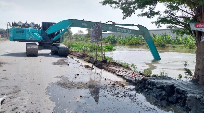 ปทุมธานี – อบจ.ส่งแม็คโครบูมยาว 5 คันเสริมคันกั้นน้ำคลองขุดใหม่หลังน้ำสูงขึ้น 2-3 ซม.ต่อวัน
