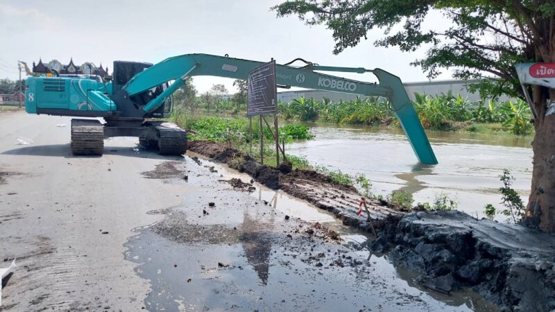 ปทุมธานีอบจ.ส่งแม็คโครบูมยาว 5 คันเสริมคันกั้นน้ำคลองขุดใหม่หลังน้ำสูงขึ้น 2-3 ซม.ต่อวัน