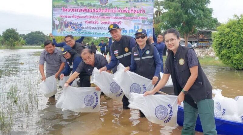 จังหวัดลพบุรี – ประมงปล่อยพันธุ์ปลาลงทุ่งบ้านหมี่ ท่าวุ้งแก้มลิงมูลนิธิชัยพัฒนากว่า 30 ล้านตัว