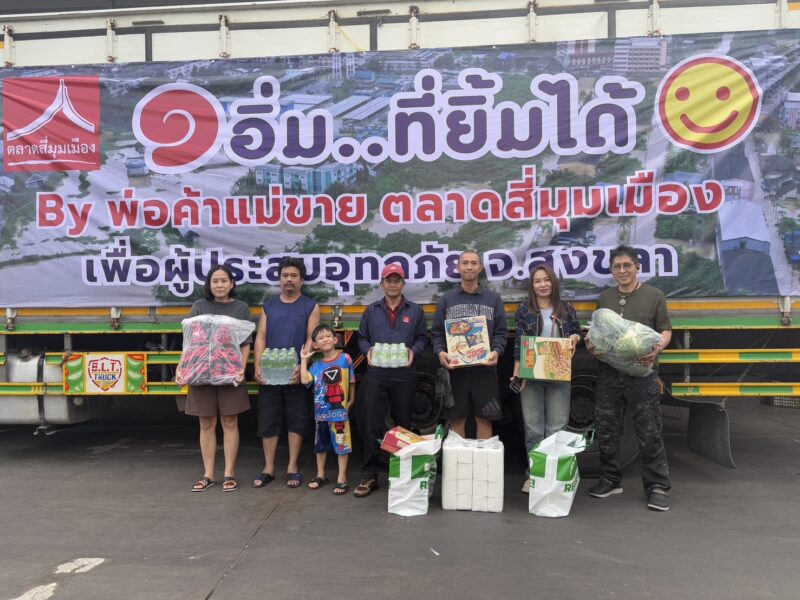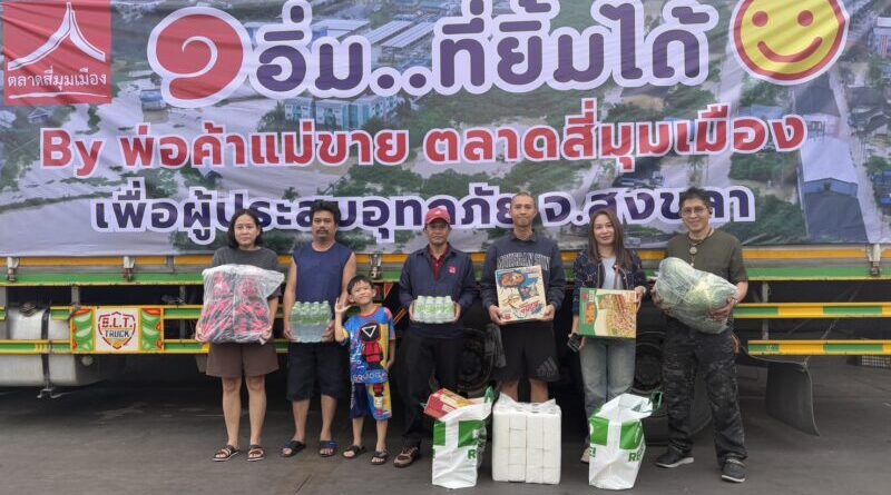 วันที่ 26 พฤศจิกายน 2568 ตลาดสี่มุมเมือง ร่วมกับพ่อค้าแม่ค้าในตลาด ได้ผนึกกำลังกันเดินหน้าโครงการ “๑ อิ่ม..ที่ยิ้มได้” เพื่อส่งมอบความช่วยเหลือไปยังผู้ประสบภัยน้ำท่วมในพื้นที่ อ.หาดใหญ่ จ.สงขลา โครงการนี้ได้ระดมบริจาคทั้งสินค้าเกษตรและเครื่องอุปโภคบริโภคที่จำเป็นต่อการดำรงชีพจำนวนมาก อาทิ: ผัก, ผลไม้, น้ำดื่ม, ข้าวสาร, อาหารแห้ง, อาหารกระป๋อง ของใช้จำเป็น เสื้อผ้า, ผ้าห่ม, หมอน, สบู่, แชมพู, ยาสีฟัน, ผ้าอ้อม ฯลฯ สิ่งของบริจาคทั้งหมดจะถูกลำเลียงและส่งต่อในเย็นวันนี้ ไปยัง โรงครัวพระราชทาน ค่ายเสนาณรงค์ อ.หาดใหญ่ จ.สงขลา ก่อนที่เจ้าหน้าที่ภาคพื้นดินจะนำไปกระจายต่อให้กับประชาชนที่ได้รับผลกระทบจากสถานการณ์น้ำท่วมในพื้นที่ต่อไป